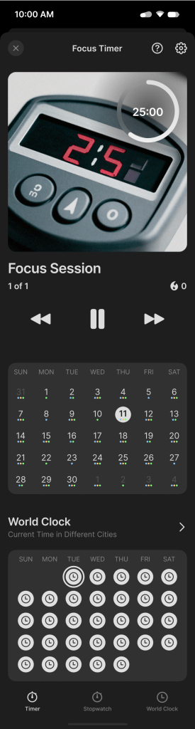 a laptop app for focusing, setting timers, stopwatches, and a world clock in a windows 11 fluent design language