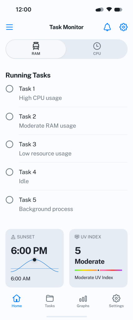 Design an app which can monitor running tasks and has tabs with graphs that show current resource usage like RAM and CPU