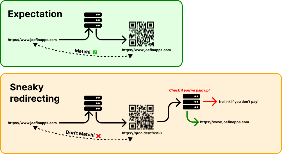 People think when they put in a website URL into a QR Code generator they are getting that exact URL encoded into the QR Code. Since most people can’t read QR Code’s they just have to trust the website didn’t do anything sneaky. Unfortunately many websites send the QR Code to their website, that way they can charge you after a “trial period” to keep the code pointing to your final destination.