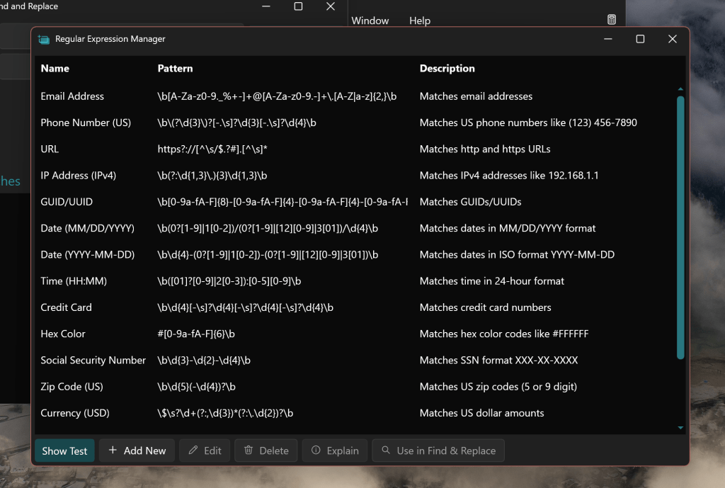In addition to wanting to be able to perform calculations, I’ve wanted the ability to save and recall RegExes quickly and easily. Now starting from the Find and Replace dialog, you can open the RegEx manager and select from the starting expressions, modify them, and make your own! These will be popping up in more places so keep an eye out for future releases!