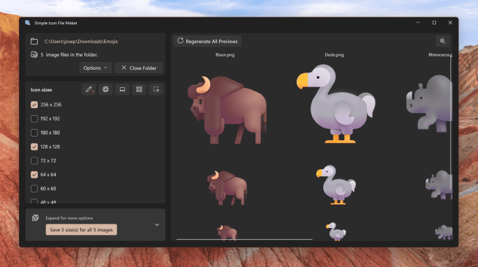 Generating icon files can frequently be a repetitive process. Simple Icon File Maker can reduce some of that repetition by opening a folder of images and generate icons for each image all at once. In addition to customizing sizes, opening a folder is a Pro feature. Upgrading today will enable all feature today and in … Continue reading Simple Icon File Maker Can Open a Folder